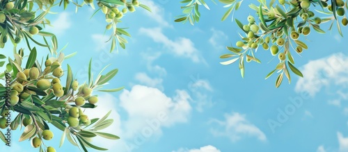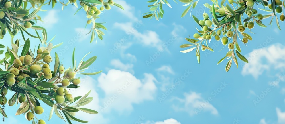 Poster olive tree branches with leaves and fruit set against a blue sky. copy space image. place for adding