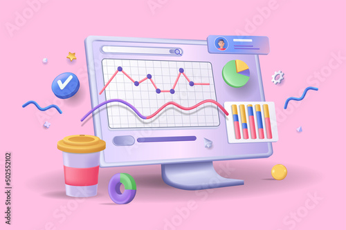 Poster online marketing concept 3d illustration. icon composition with computer display with charts, graphs