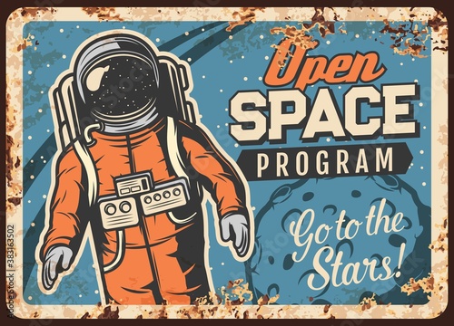 Poster open space program vector rusty metal plate. astronaut in outer space, universe exploration vintage