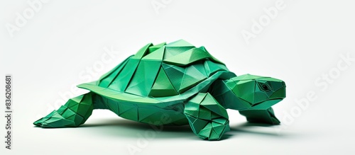 The watermark will not be included on Poster.: Origami turtle made of green paper on a white background with copy space image -