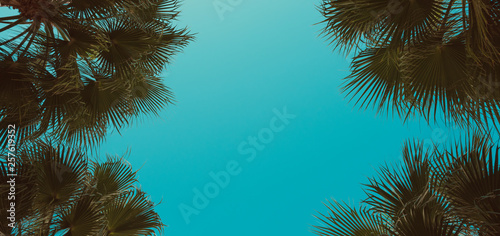 Poster : Palm trees perspective view - frame composition with corner tropical palm leafs and center copy-space