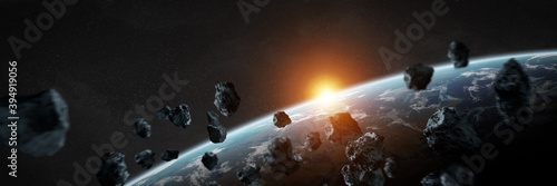 Poster panoramic space planets background. panorama of distant solar system with exoplanets 3d rendering el - Posters Poster panoramic space planets background. panorama of distant solar system with exoplanets 3d rendering el - Posters