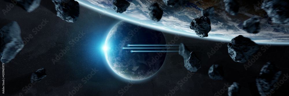 Poster panoramic space planets background. panorama of distant solar system with exoplanets 3d rendering el - Posters Poster panoramic space planets background. panorama of distant solar system with exoplanets 3d rendering el - Posters