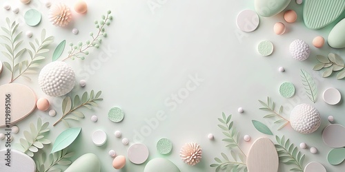 The watermark will not be included on Poster.: Pastel-colored abstract shapes and greenery composition with copy space