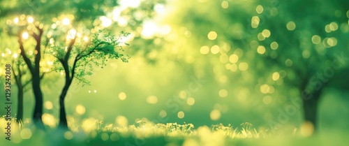 Poster peaceful bokeh nature background with vibrant green trees and sunlight creating a serene atmosphere