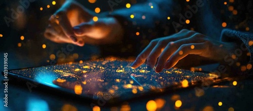 The watermark will not be included on Poster.: Person's hands using a tablet device with an illuminated screen and golden lights -