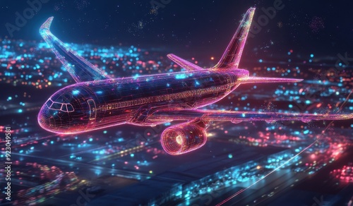 Poster photo of a futuristic airplane with visualization lines and colorful neon high technological pattern