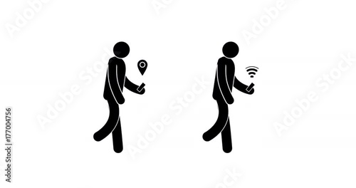Poster pictogram man walking cycle with smartphone in hand. two options - with gps and wi-fi signal. looped