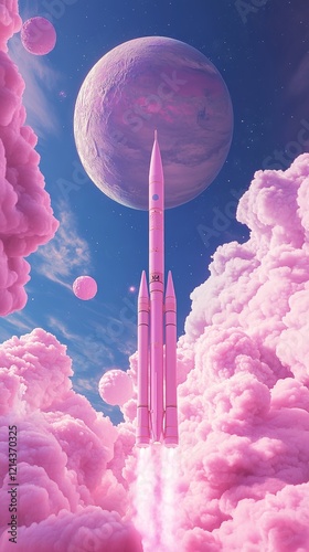 The watermark will not be included on Poster.: Pink rocket ship launching from planet earth through pink clouds towards a new planet in space explo