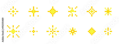 Poster : Pixel star retro 8 bit sparkle set - shiny game pixel art effect set - firework burst, space decoratio
