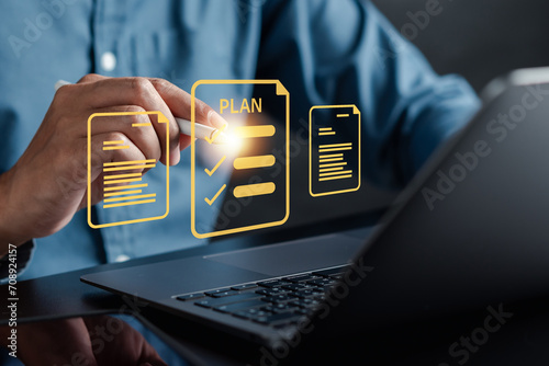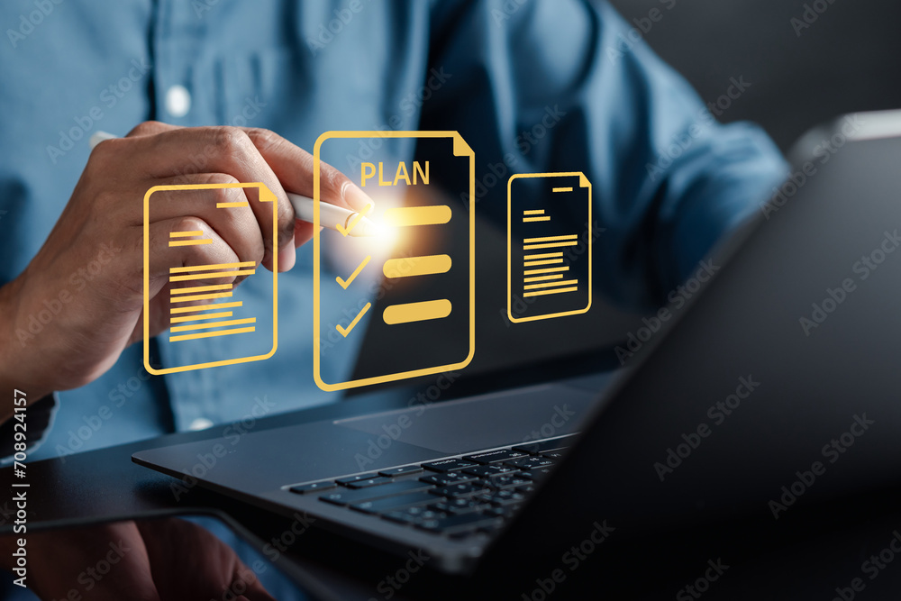 Poster : Planning task and online survey filling out digital form checklist by laptop computer, document mana