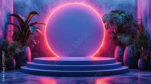 The watermark will not be included on Poster.: Podium with neon background, mockup display stand for product presentation - generative ai -