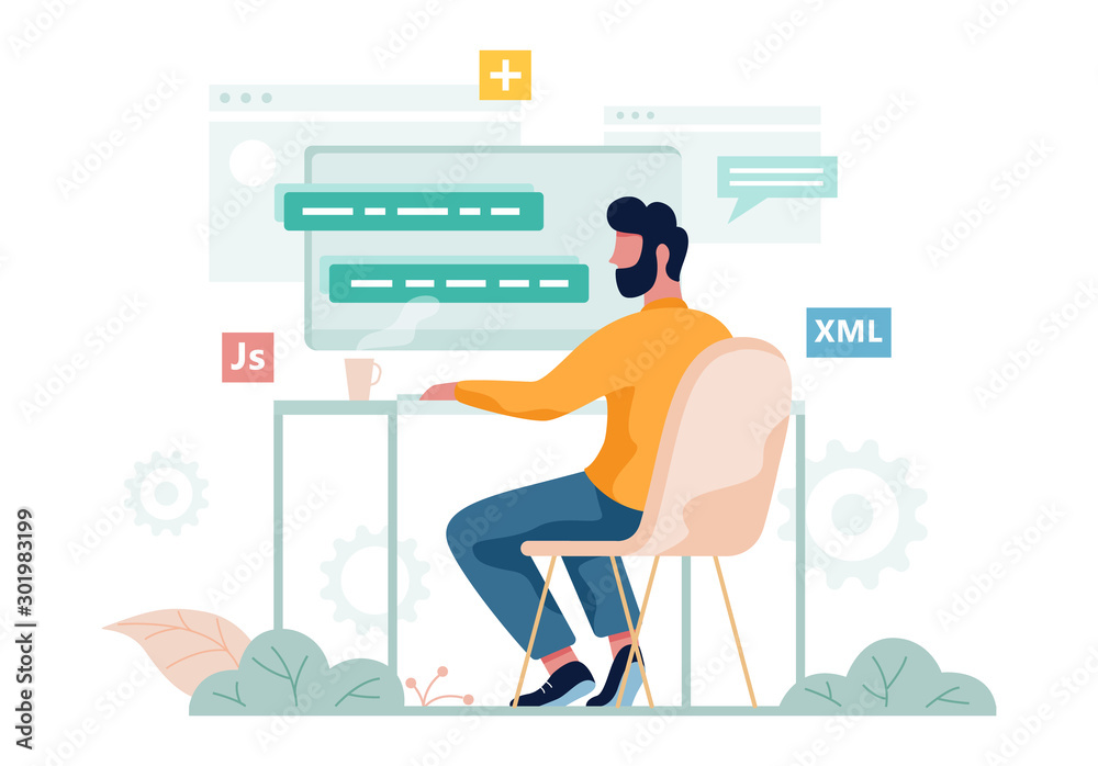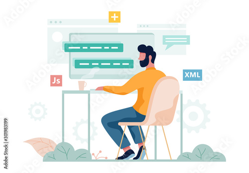 Poster porgrammer sitting at desk. web developer workplace. software programming