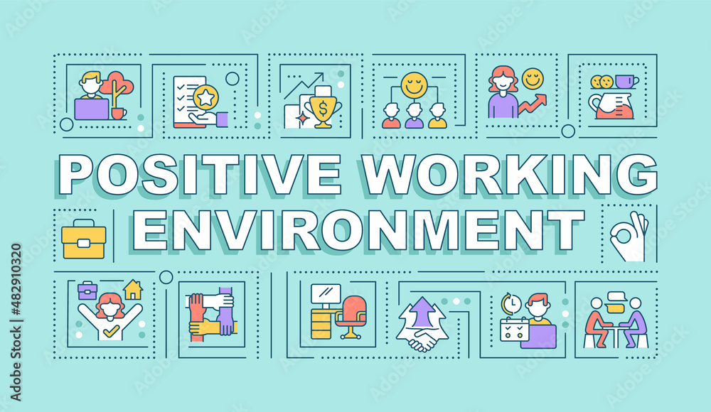 Poster positive working environment word concepts mint banner. boosting performance. infographics with icon