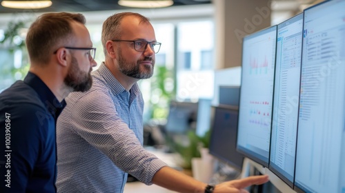 The watermark will not be included on Poster.: Project manager and it specialist collaborating in a monitoring office