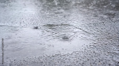 The watermark will not be included on Poster.: Raindrops continuously fall and form expanding puddles on an asphalt surface, showing the wet transf