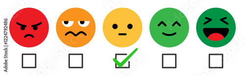 Poster rating emoji set with check box and tick mark for customer feedback and experience with bad, poor, a
