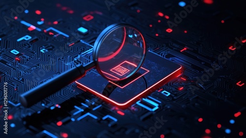 The watermark will not be included on Poster.: Red and blue printed circuit board with magnifying glass highlighting symbol in a high-tech conceptu