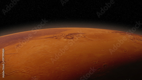 Poster red planet mars in natural colors, surface close up with visible atmosphere