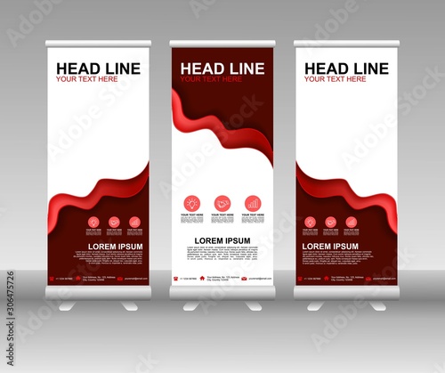 The watermark will not be included on Poster.: Red roll up banner stand - vertical vector template design - modern flag banner design with abstract b