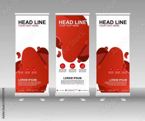 The watermark will not be included on Poster.: Red roll up banner stand - vertical vector template design - modern flag banner design with abstract b