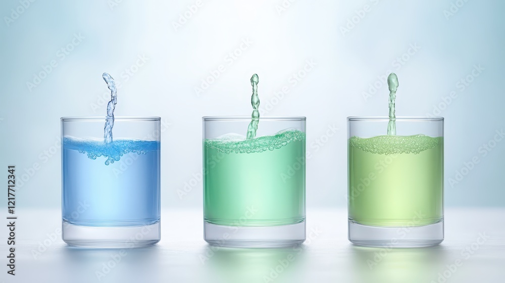 The watermark will not be included on Poster.: Refreshing image, three glasses of pure water with dynamic splashes
