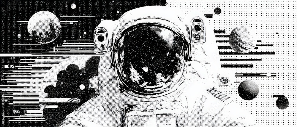 The watermark will not be included on Poster.: Retro astronaut in space with planets and halftone pattern vintage spaceman exploring cosmos in mono