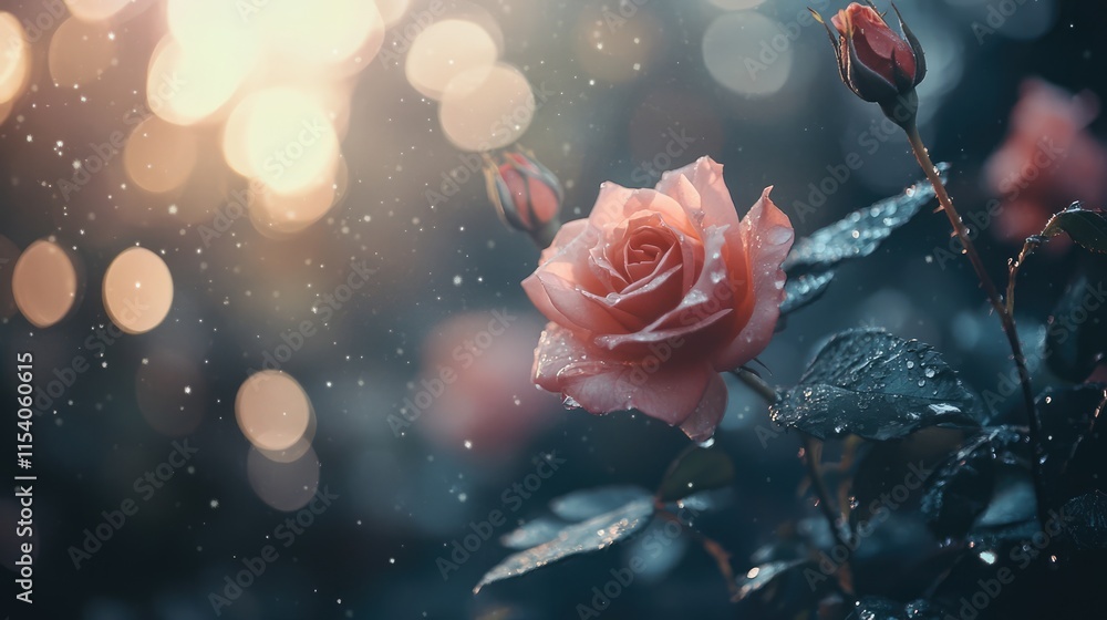 Poster roses with droplets on petals in soft focus bokeh background creating an elegant and romantic atmosp