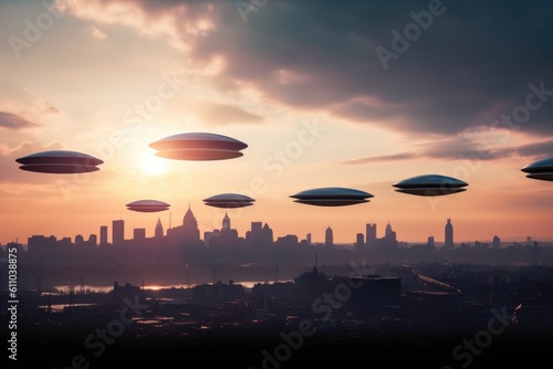 Poster row of flying saucers hovering above the city skyline, created with generative ai