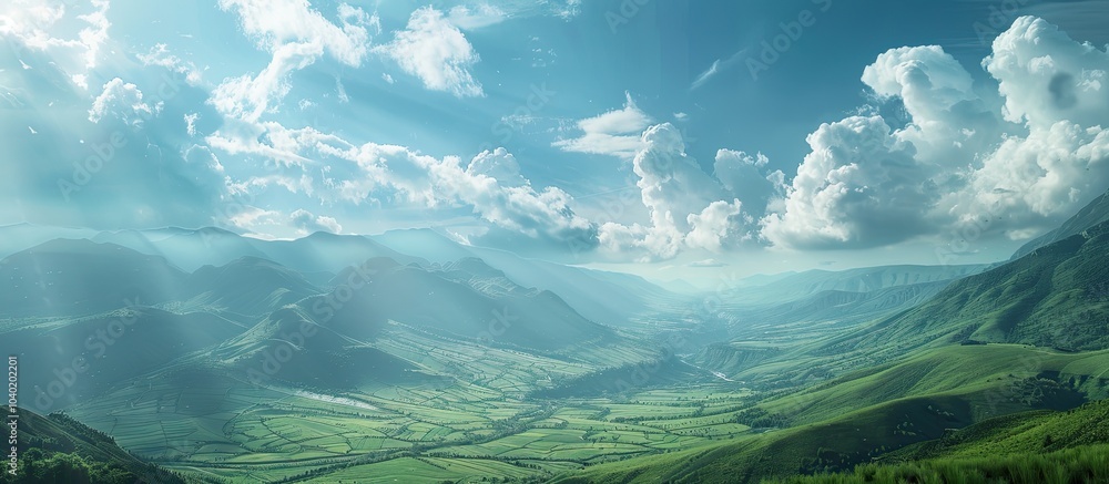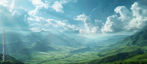 Poster scenic view of fields and mountains from the mountain top under a cloudy blue sky with ample copy sp