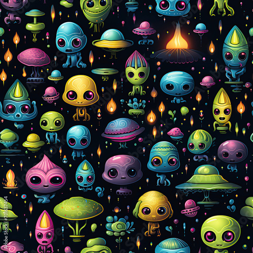 The watermark will not be included on Poster.: Seamless pattern texture with funny cartoon characters multicolored neon aliens in space on black ra