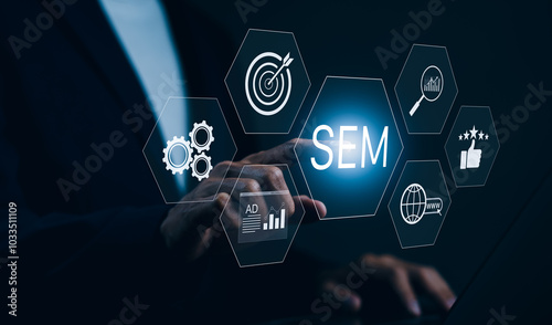 The watermark will not be included on Poster.: Sem search engine marketing concept - businessman touching virtual icons representing search engine m