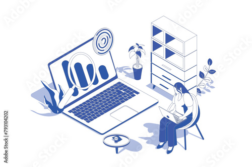 Seo optimization 3d isometric concept in isometry graphic design for web - people scene with woman woPoster