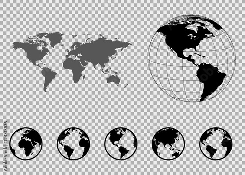 The watermark will not be included on Poster.: Set of globes with different continents and a map earth