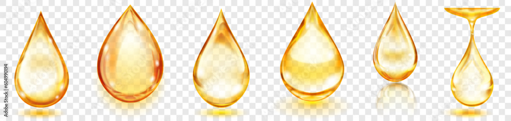 Poster : Set of realistic translucent water drops in yellow colors in various shapes with glares and shadows,
