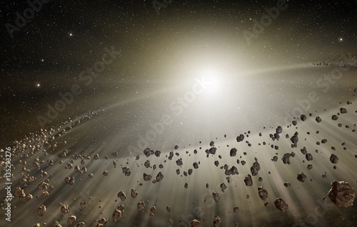 The watermark will not be included on Poster.: Shining explosion and scattered rocks in the deep space