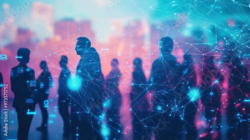 The watermark will not be included on Poster.: Silhouettes of people walking through a network of glowing lines -