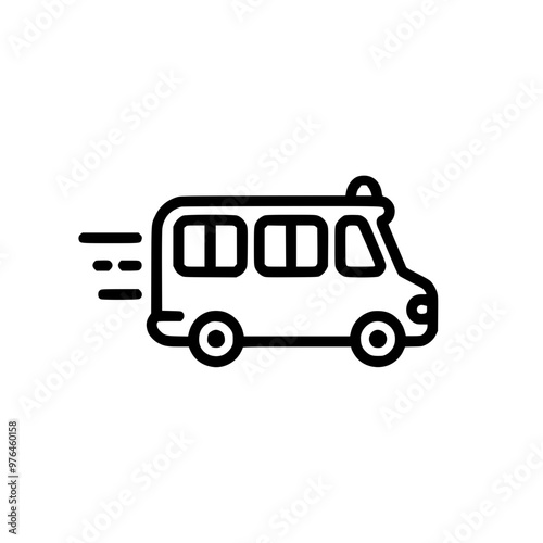 Poster simple black and white icon of a moving school bus with lines indicating speed on a white background