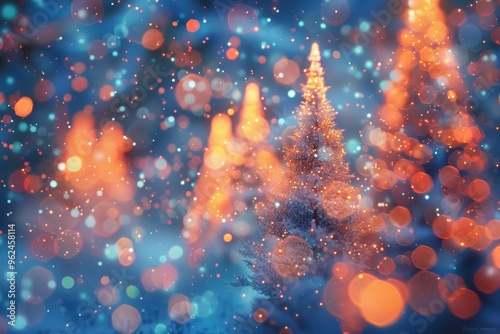 Poster : Snow-covered christmas trees adorned with glowing lights set in a winter wonderland with bokeh light