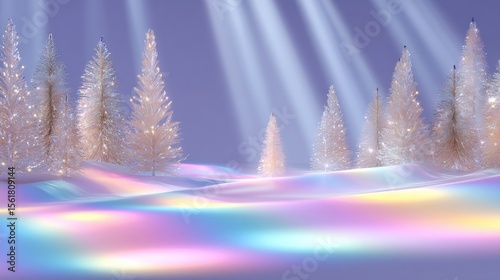 The watermark will not be included on Poster.: Snowy landscape with illuminated trees and colorful light reflections under a serene sky -