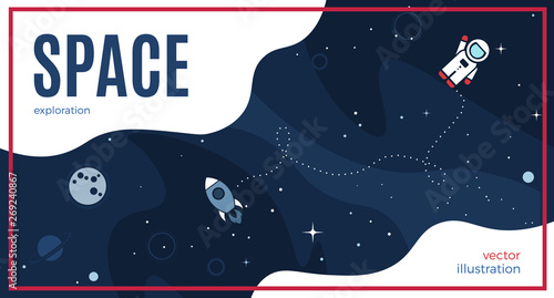 Poster space background with cosmos and white empty place for text. cute template with astronaut, spaceship