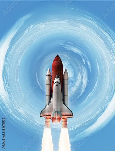 Poster space shuttle in the clouds. launch of spaceship from earth planet. space wallpaper. elements of thi
