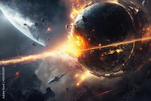 The watermark will not be included on Poster.: Space war human and alien in outer space for star colony - distinct generative ai image -