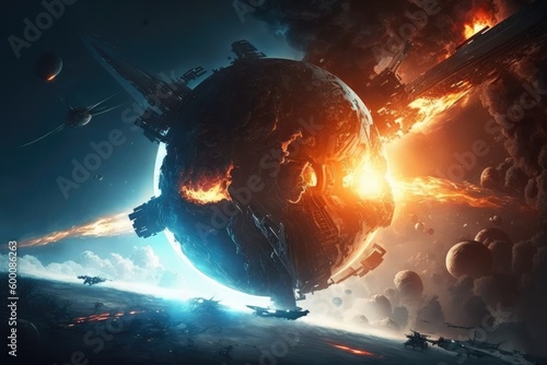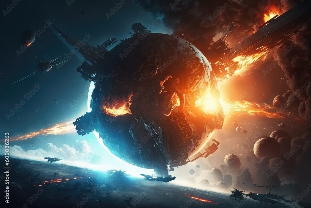 The watermark will not be included on Poster.: Space war human and alien in outer space for star colony - distinct generative ai image -