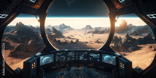 Poster spaceship dark interior with view on distant planets solar system. generative ai aig15.
