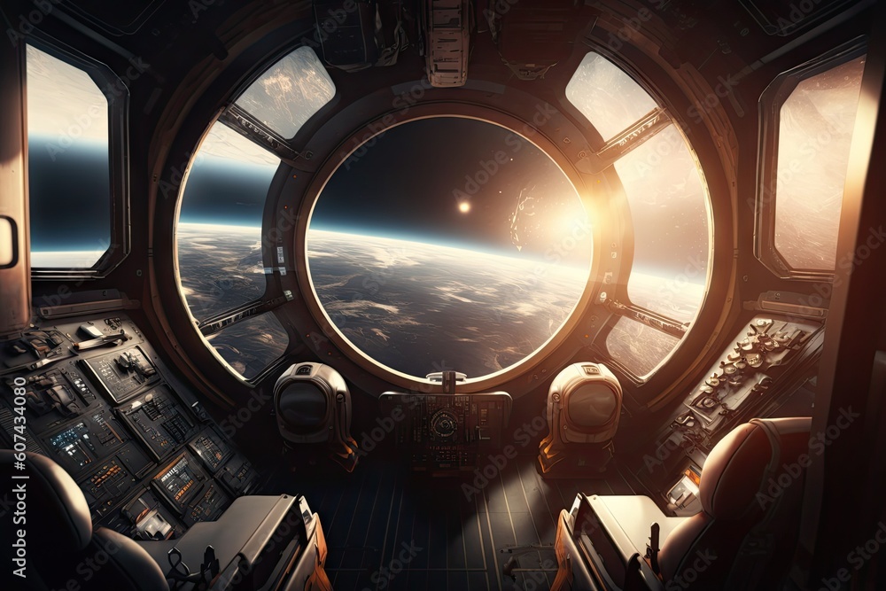 Poster spaceship dark interior with view on distant planets solar system. generative ai aig15. - Posters Poster spaceship dark interior with view on distant planets solar system. generative ai aig15. - Posters