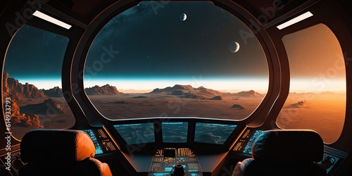 Poster spaceship dark interior with view on distant planets solar system. generative ai aig15.