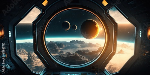 Poster spaceship dark interior with view on distant planets solar system. generative ai aig15.