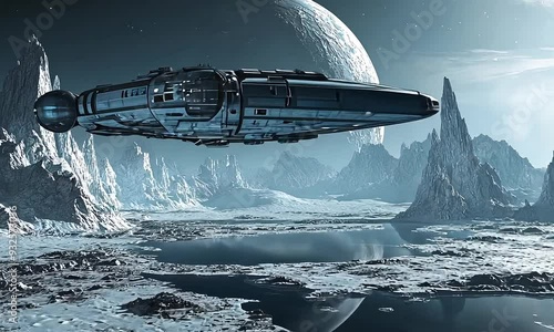 The watermark will not be included on Poster.: Spaceship flying over icy alien landscape with distant planet with ai generated -