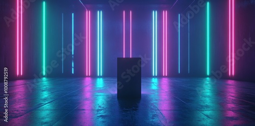 Spaceship lab with empty podium interior architecture with glowing neon for cyberpunk product presenPoster